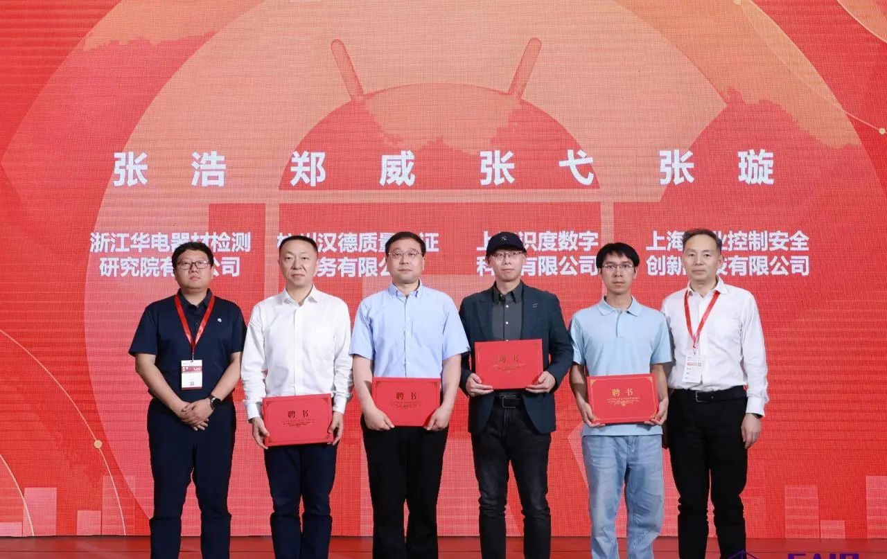 工作组组长郑军奇、副组长刘宇飞为来自浙江华电器材检测东升国际有限公司、杭州汉德质量认证服务有限公司、上海识度数字科技有限公司、上海工业控制安全创新科技有限公司工作组新进成员颁发专家聘书。