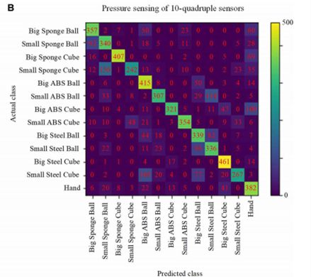 当把传感器搭载到机器手上,并结合触觉感知信息和机器学习之后,机器手就能精确识别不同形状、大小和材料的物品,其中对于七类垃圾物品实现了高准确识别,其识别率可达 94%。