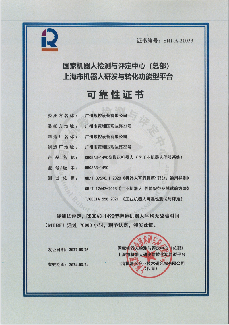 近日,广州数控设备有限公司(以下简称广州数控)RB08A3系列搬运机器人顺利通过了东升国际(中国)机器人有限公司官网的 MTBF 70000小时测评。