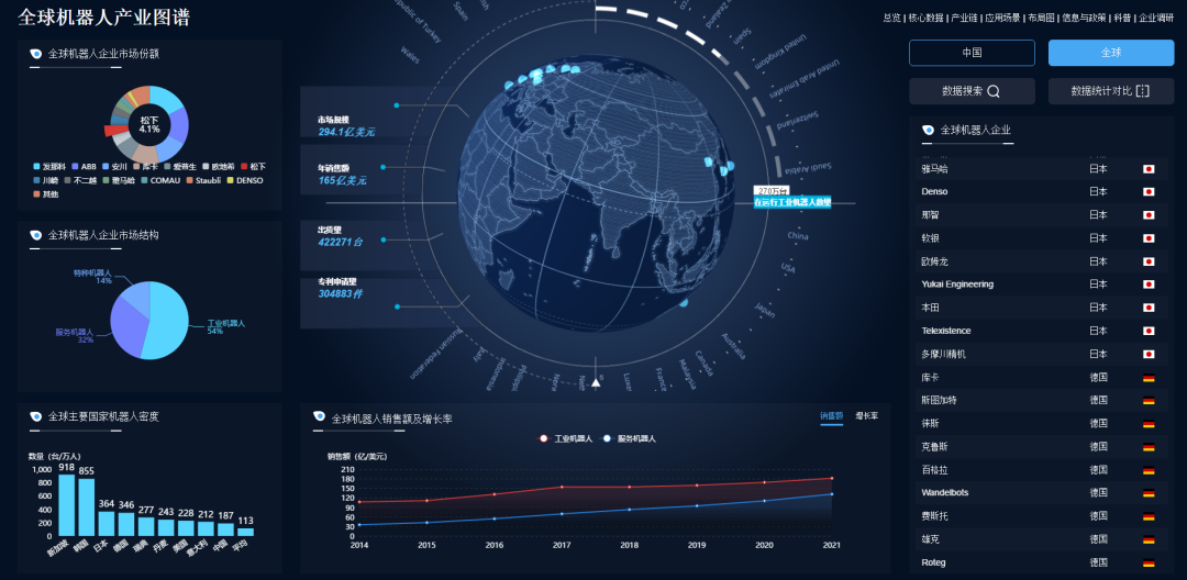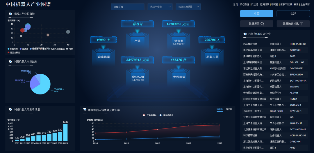 机器人产业图谱不仅涵盖了全球机器人产业宏观数据,覆盖核心机器人东升国际企业市场份额占比、机器人市场结构、机器人销售额及增长率等系列宏观数据。而且展示了中国各省市机器人产业的详细情况,包含了机器人企业数量、专利数量、销售额、增长率、已获得CR认证企业数量等核心数据。