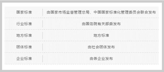 目前,我国标准分为国家标准、行业标准、地方标准、团体标准和企业标准。