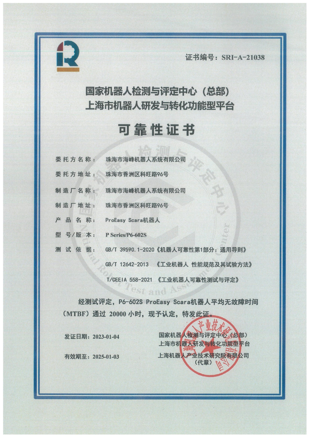 1月3日,珠海市海峰机器人系统有限公司的ProEasy 机器人P6-602s SCARA机器人顺利通过东升国际(中国)机器人有限公司官网的MTBF 20000小时测评。